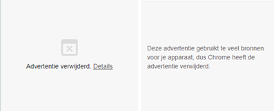 Eind augustus zal Google dus heavy ads gaan blokkeren binnen Chrome als deze aan één of meerdere van bovenstaande criteria voldoen. Wordt er een advertentie geblokkeerd, dan krijg je dit te zien op dezelfde plek waar de advertentie zou moeten staan: