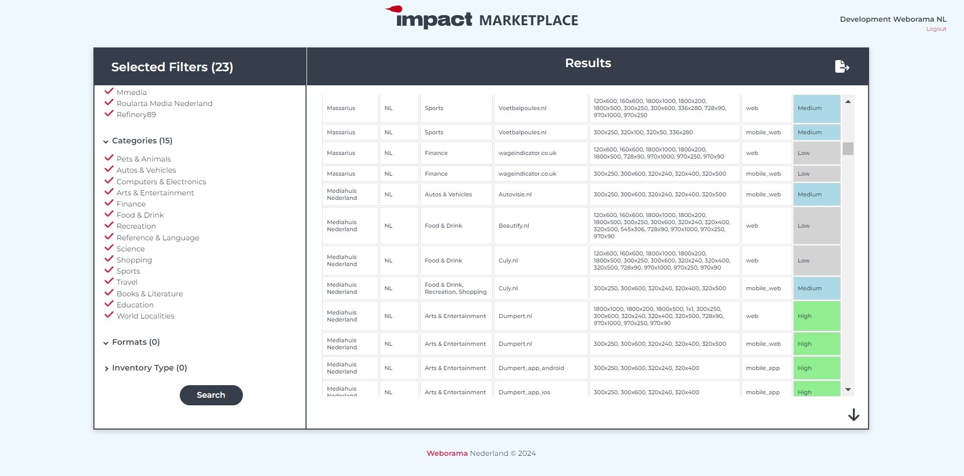 6. Door op “search” te klikken krijg je nu een overzicht met alle gemaakte keuzes: de publishers, categorieën, bijbehorende url’s, formaten en type inventory, maar wordt het ook direct duidelijk wat de real-time advertentieruimte is bij de gekozen publishers.