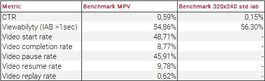 Vergeleken met de interscroller scoort deze qua CTR zelf iets beter 0,58 (vs.0,47). Viewability is met ruim 54% vergelijkbaar met de interscrollers maar als we kijken naar de videostats zien we interessante dingen. Videostarts zitten iets onder de viewability stats maar 8,7% ziet de video helemaal uit. Als de uiting uit beeld scrolt pauzeert de video maar 9,7% scrollt terug om de uiting toch verder te kijken.