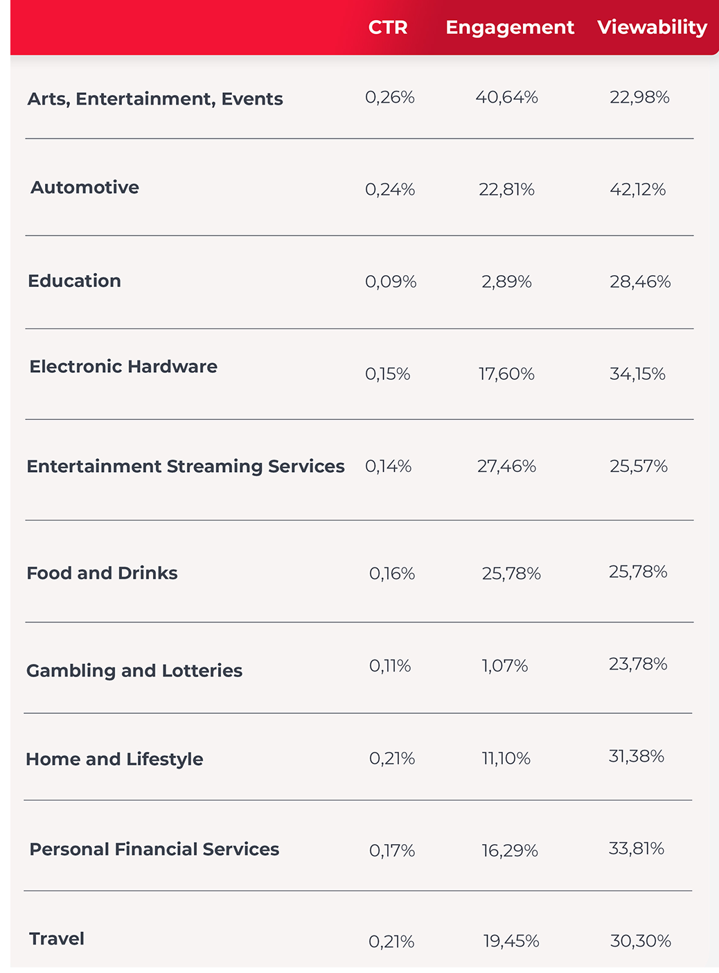 Welke categorieën, waarin veel Rich Media wordt ingezet, scoren hoog als het gaat om CTR, Engagement en Viewability?