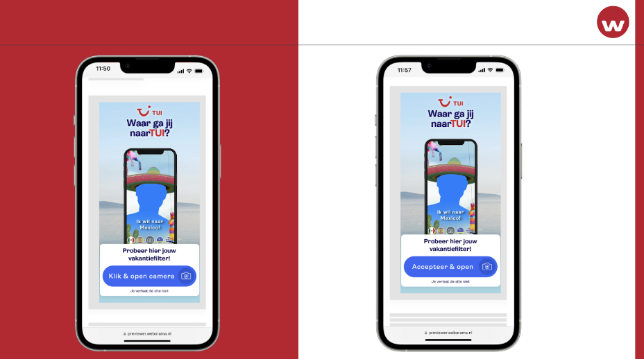 Ga dus na; begrijpt een algemene gebruiker wel wat er moet gebeuren? Mocht je hieraan twijfelen, doe het dan eerst een keertje voor met een auto-interactie. Verwerk bijvoorbeeld een nudge, een bewegend handje of een pulse in de creatie die voordoet wat er moet gebeuren. Test daarnaast verschillende call to actions om te achterhalen welke de creatie het best aanvult. Zo had onderstaande TUI AR banner bij de linker versie drie keer zoveel AR-starts, terwijl slechts de copy iets verschilt.