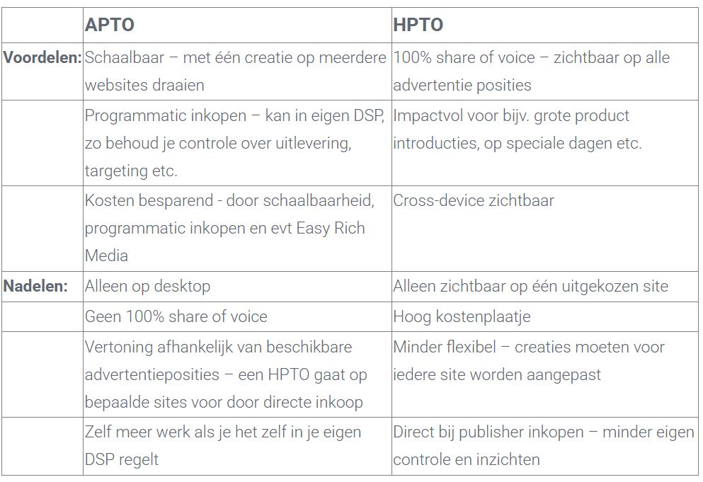 Als we naar beide Takeovers kijken dan merken we dat de APTO en HPTO regelmatig met elkaar worden verward omdat ze allebei opvallend zijn, voor interactie zorgen en een groot deel van de site in beslag nemen. Toch verschillen ze best veel van elkaar. Om dit wat meer op te helderen staan we voor beide even stil bij het formaat, de creatie, manier van inkopen en share of voice en geven we een overzicht van de eventuele voor- en nadelen.